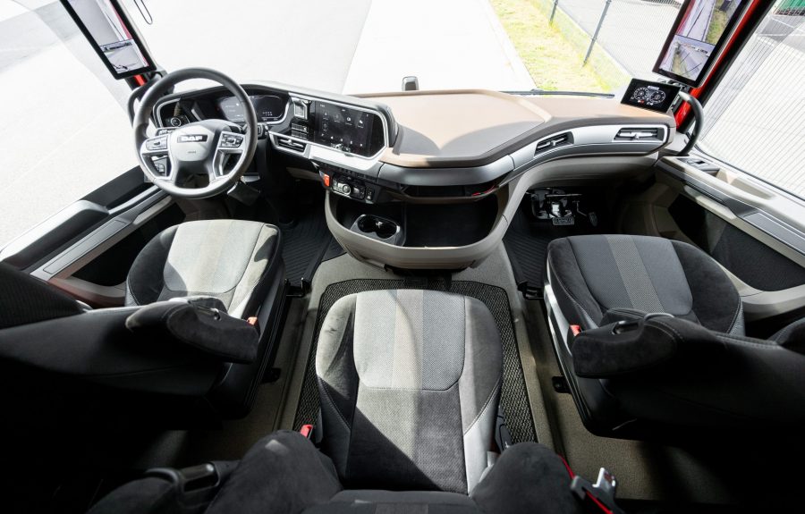 Bei der BKF Aus- und Weiterbildung benötigt man Platz, was sich problemlos mit drei bis fünf Einzelsitze darstellen lässt. Die Sitze in der zweiten Reihe verfügen hierbei über ein hohes Maß an Beinfreiheit und Komfort, was besonders lange Strecken angenehmer werden lässt. Das DAF-Fahrerhaus ist ein wahres Raumwunder mit einer Stehhöhe von 2,17 m beim XG+, was einen einfachen Ein- und Ausstieg sowie ein angenehmes Agieren von mehreren Personen über längere Zeit im Fahrzeug erlaubt. Dazu gibt es hinter dem Mittelsitz Platz für eine Kühlbox oder eine zusätzliche Ablagefläche. Der weit ausziehbare Tisch im Armaturenbrett erleichtert die Dokumentenbearbeitung.